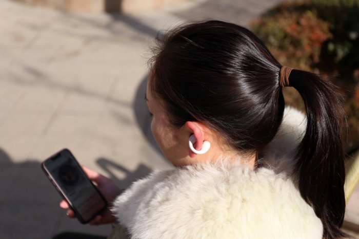 下面这张图就是佩戴之后的效果,可以看到它的发音单元是全部处于耳蜗之内的,从而达到定向传音的效果,而操控区域则位于耳后,这样不但能保证声音的质量,减少漏音,同时操作也会方便很多。
