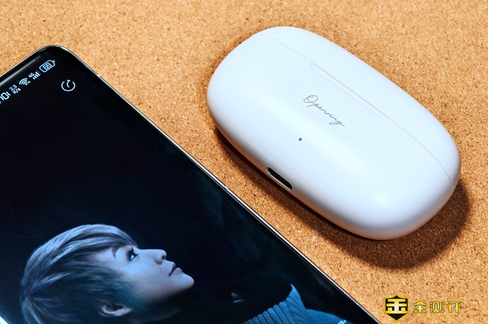 充电盒比较细长,边角圆润,握感舒适,正面印有花体的英文“OpenRing”,下方带有一颗指示灯,背面则印有“冇心”品牌logo。
