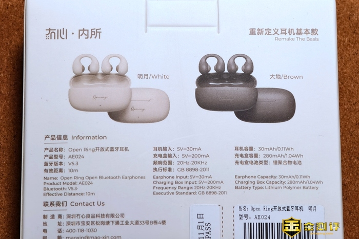 冇心OpenRing的外包装中规中矩,正面为耳机的产品图片,背面对耳机的参数进行了介绍,可以看到这款耳机有明月和大地两种配色,我拿到的是明月配色,有点类似于米白色。