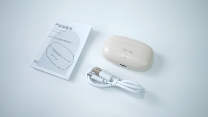 冇心Open Ring开放式蓝牙耳机本着基本款的原则,在配件方面提供了一根Type-c接口的充电线,以及一本使用说明书,将一些非必要的赠品取消,把投入全放在耳机本身上。