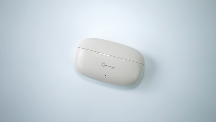 冇心Open Ring开放式蓝牙耳机充电仓非常小巧,整体设计偏圆润,充电仓的正面印有这款耳机的Slogen,Opening,这也标志着冇心Open Ring开放式蓝牙耳机是一款开放式的蓝牙耳机。