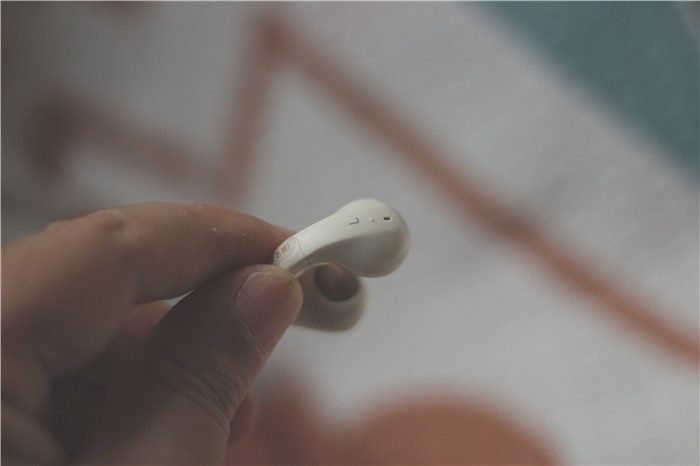 鹅卵石的设计造型,拿到手心上感觉非常得心应手。正面有这款OpenRing耳夹式蓝牙耳机英文标识,指示灯。