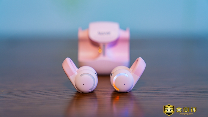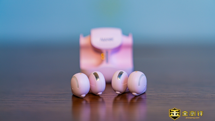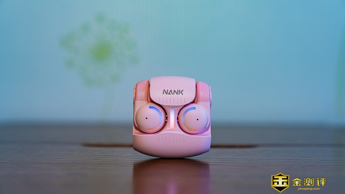 这款耳机采用了全新的开放式形态,充电仓正面为南卡的英文LOGO,中间为充电仓的指示灯,其两侧则是耳机的充电指示灯及麦克风。