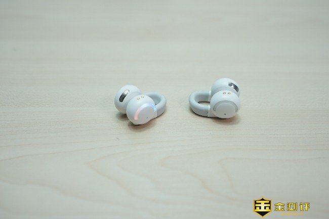 耳机外侧镶嵌有半圈月牙形指示灯,在佩戴的时候亮起,非常炫酷。