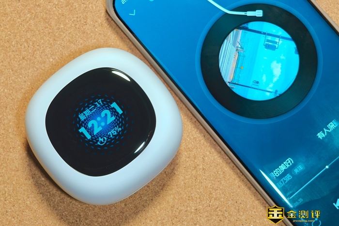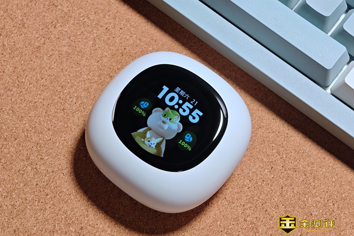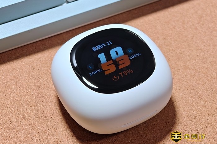塞那S5 Pro的电池仓正面设计有一块圆形触控屏,显示效果清晰细腻,内置有6款主题,我们还可以通过APP下载更多自己喜欢的主题。这块屏幕能够实时显示耳机的电量、电池仓的电量甚至时间和天气等内容。
