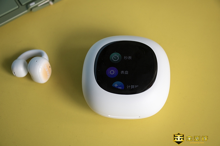 值得一提的是,SANAG塞那S5 PRO的充电仓设计得非常时尚,还具有一块C.Fus全彩触摸屏。通过这块屏幕,我可以查看天气、使用计算器、秒表等功能,非常方便实用。而且充电仓还内置了32GB内存,可以独立播放音频文件,相当于一个小音箱,这在同类产品中并不多见。