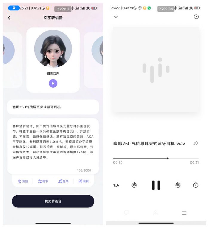 还有一个功能就是文字和语音进行互转,就是你可以描述一段文字,它可以使用不同风格的AI语音播放出来,另外也可以把你说得到语音进行不同国家语音文字表现出来。是不是很厉害的样子。