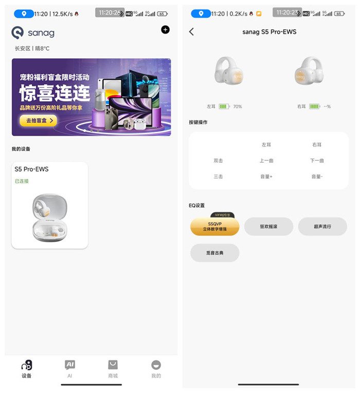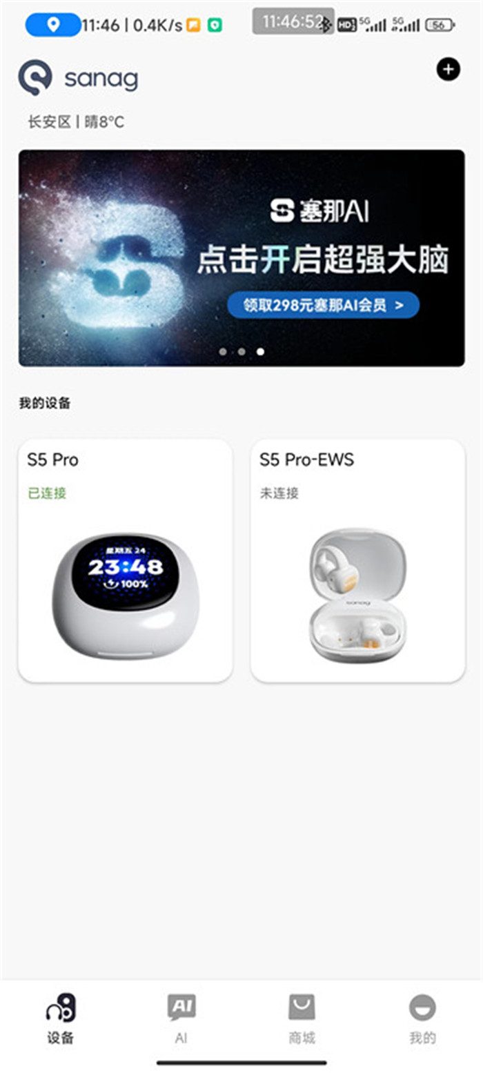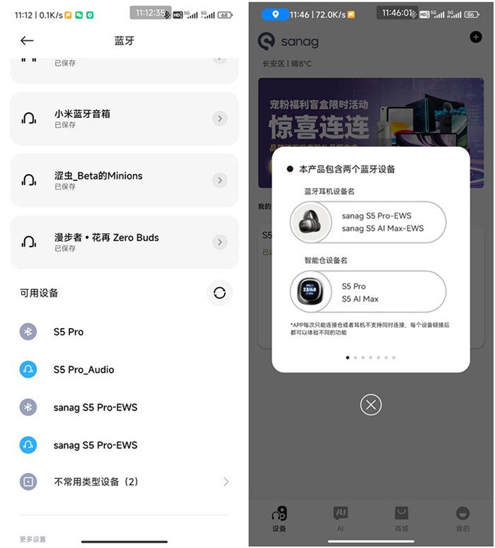 通过下载Sanag进行蓝牙配对,可以发现两种设备蓝牙设备,这里需要简单说明,EWS为耳机设备,S5为充电仓设备,也就是说除了可以连接耳机,充电仓也可以和APP进行适配的。