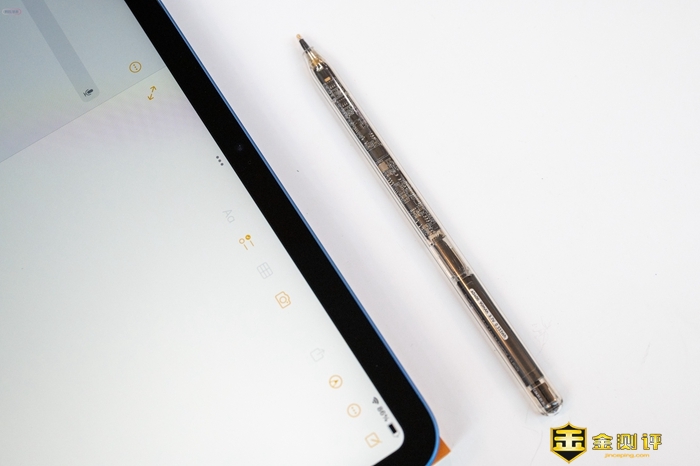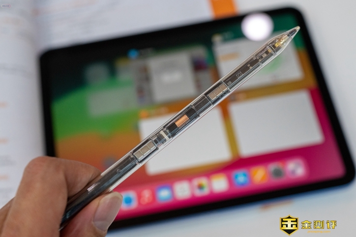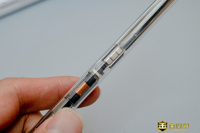 西圣Pencil 2本身的设计特别好看,是一种透明外外壳,我们能够直接清晰地看到内部精密排列的元器件,展现出强烈的科技感。在笔身支持磁吸的这一面当然也是采用了平面的设计,便于和iPad吸附,这一面还可以看到磁吸的各种组件,十分清晰。