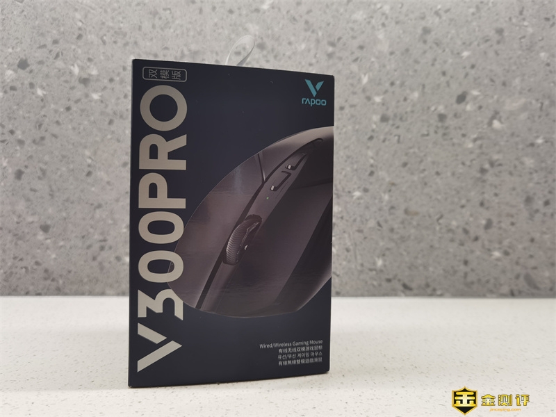 雷柏V300PRO双模游戏鼠标的包装图案和外观设计延续了雷柏的传统风格,满满的电竞风,给人很酷炫的感觉,正面有产品外观、型号以及Logo等信息。