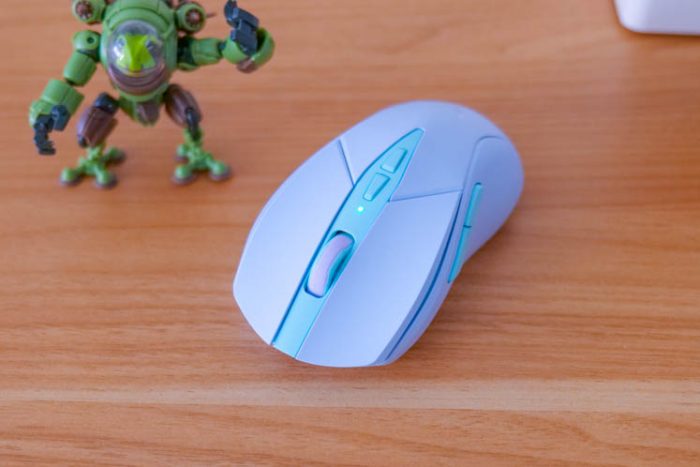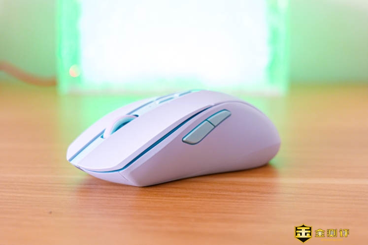 澜沧版的配色非常漂亮,浅蓝色的主体搭配淡绿色的点缀,流畅的曲线将色彩分割开来,令人赏心悦目。鼠标是前宽后窄的造型,轻量化设计的重量仅有77g,操作时不会有明显的负重感,长时间使用不会累手。