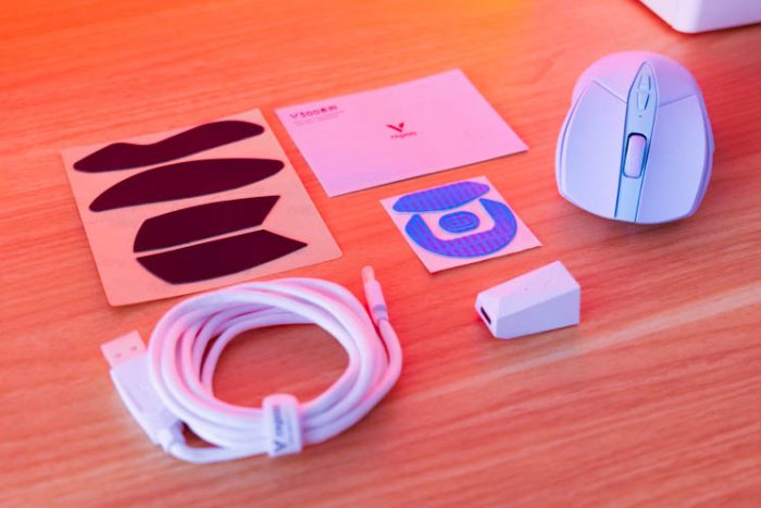 鼠标可以有线/无线双模使用,数据线是非常柔软的伞绳,操作时不会产生拖曳感。无线接收器能够收纳在鼠标内部,防止丢失。无线模式除了操作更加灵活、让桌面更加简洁,也更方便携带,适合公出时使用。除了接收器和数据线,附件中还赠送了防滑贴、一套备用的防滑脚垫以及A-C转接头,这个转接头用处很大,它除了可以延长数据线,也能够将无线接收器转移至桌面,消除信号传输中的物理阻隔。另外它的磁吸盖还能更换为充电模块,将鼠标扩展出无线充电功能。