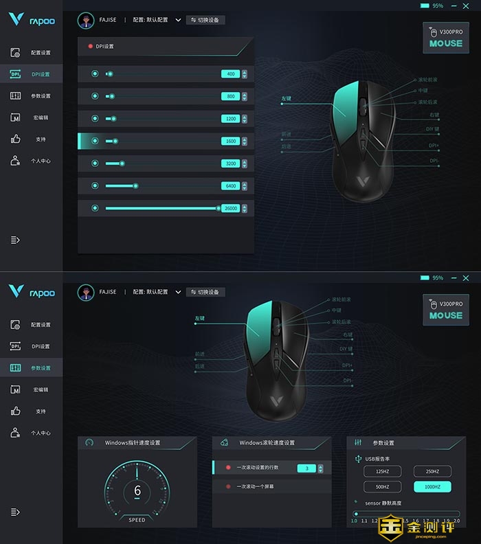 另外鼠标上上下下共计有10个按键,并且所有的按键都可以自定义的。只要安装雷柏的官方驱动,就可以实现。并且它还有其它的功能可以设定,如DPI档位调节,方便快速的调节到想要的档位。还有回报率,静默高度等参数设置。可以自由的定制打造属于自己的个性化鼠标,并且所有的鼠标设置可以存档服务器上,随时随地的调用。