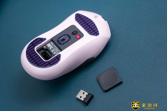 同时它底部还有个收纳仓,鼠标自带的USB接收器就收纳在这个里面,平时隐藏起来,不仅好看的同时也可以有效的防止USB接收器丢失的尴尬。