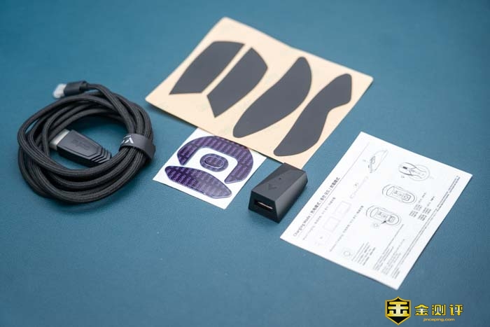 再来看下它的附件,雷柏V300PRO随机自带的附件非常多,有一条采用伞绳材质的USB数据充电线,这条线长达1.8米,伞绳的材质使得电源数据线更加的轻量化,也更加的柔软牢固,并且可以大大的降低摩擦阻力,让鼠标线的拖曳感几乎为零。