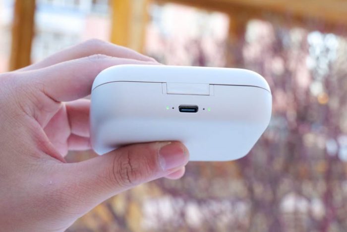 充电仓是磁吸的天地盖结构,耳机也是磁吸的,不会轻易掉出来。充电仓背面是Type-C充电接口,旁边还有两颗LED指示灯,可以依据电量不同显示不同颜色。