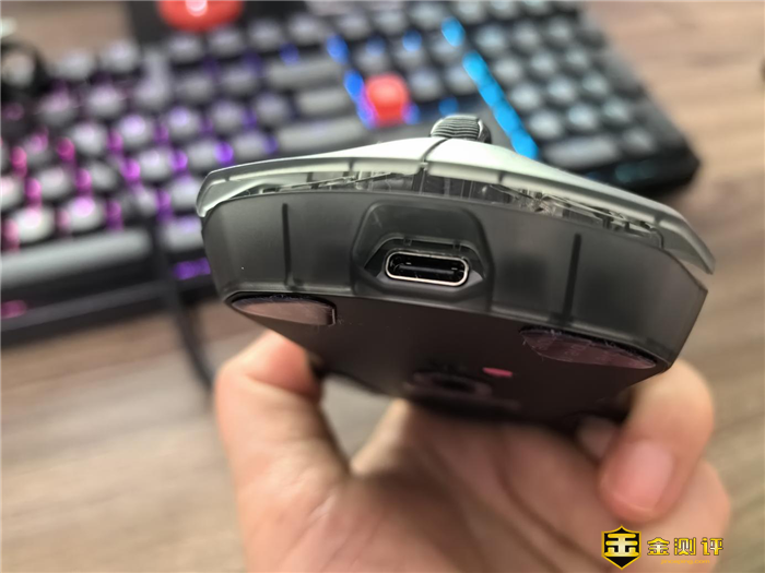 雷柏VT9 Air是兼具有线和无线两种模式双高速鼠标,所以既有有线接口,又有无线接收能力.Type-C的有线接口位于鼠标前部下方,当然这个接口也是鼠标的充电口。而4K nano接收器则隐藏在鼠标底部。