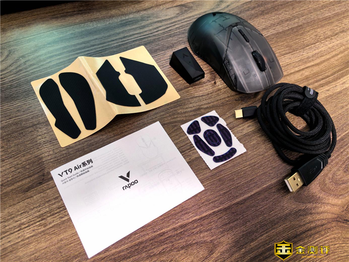 配件非常丰富。有鼠标、备用脚贴、侧裙防滑贴、按键防滑贴、电源数据线、USB转接器和一本快速使用指南。