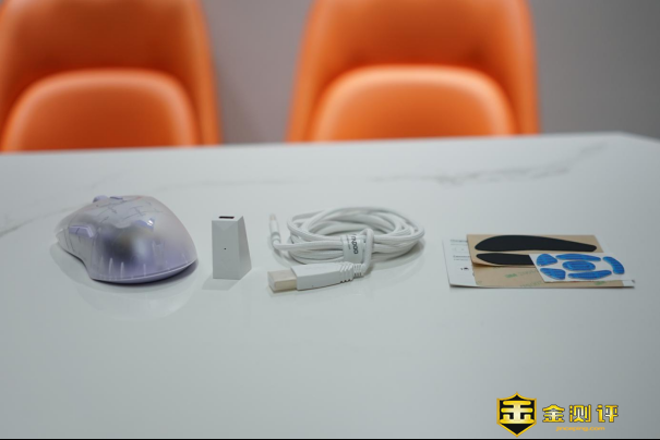 打开包装盒,除了鼠标还有使用说明书、电源数据线、防滑贴、备用替换脚垫以及USB A-C接收器。