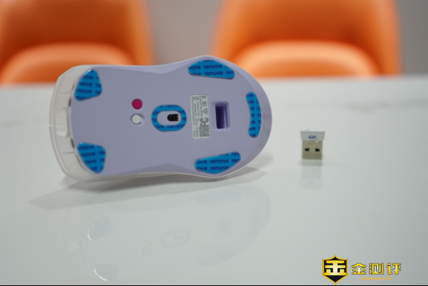 鼠标底部的按键是防误触DIY独立按键,默认功能是切换回报率。鼠标的接收器采用了微型nano设计,最高支持4K回报率,无线也能通过开启使用OTA型支持8K回报率了,上面有4K的标志、雷柏logo和指示灯,指示灯可以显示连接、对码状态,还可以显示鼠标的剩余电量百分比。