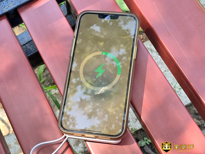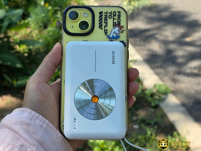 在充电宝背面可以看到一个圆形与一条直线的组合,这实际上是磁吸线圈的所在区域。对于兼容无线磁吸充电的设备,只需简单放置,即可被牢固吸附。得益于18颗强力N52磁芯,即便手机穿戴着保护壳,磁力依然强劲,确保手机在充电过程中不会滑落,从而增强了充电时的稳固性,对于使用支持MagSafe功能的iPhone机型的朋友来说,这个用起来非常方便,而且兼容性很好。