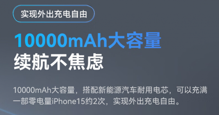 其次就是容量了,市面上主流大多是10000毫安,基本就可以实现外出充电自由了。千万别想着追求更大容量,大容量充电宝体积大使用不便不说,做个 飞机高铁很有可能还会被禁止携带。
