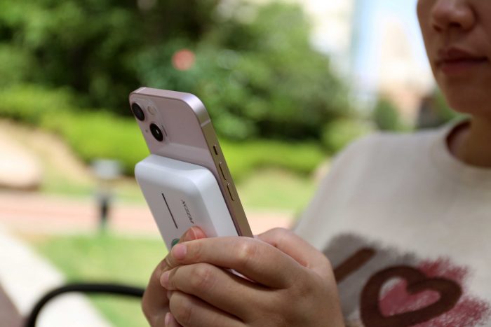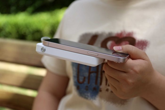 如果担心无线充电时间太长,我们也可以使用充电宝自带的数据线进行有线充电,因为在磁吸模式的加持下,可以完美的让充电宝与手机融为一体,还不会遮挡摄像模组,即使女孩子单手握持也可以轻松操作,没有线材缠绕和充电宝跌落的烦恼,非常方便。