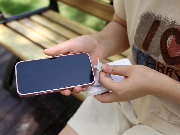 在机身侧面还可以看到一根小挂绳,抽出挂绳其实它是一根苹果lightning和TYPE-C充电线,这一设计很巧妙的让线材跟充电宝二合一,方便充电同时,小挂绳的设计也让外出携带的方式更加多样化。