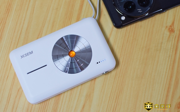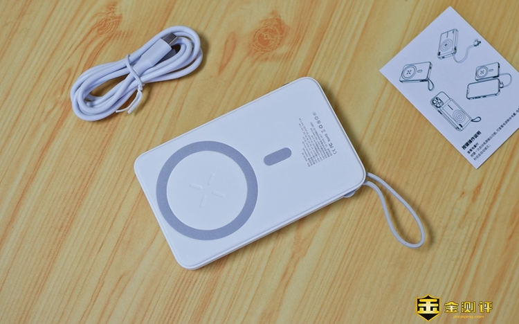 打开包装盒,里面有一份使用说明书以及一根TYPE-C口充电线,充电宝的设计非常美观,正面中间设计了一个大大的圆形金属质感作为装饰,第一眼看上去就跟随身听一样。感谢金测评