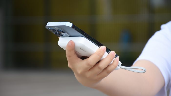 给iPhone充电可以直接通过MagSafe磁吸线圈吸附,在充电宝一侧内置有18颗N52磁铁,吸力大约1.3千克,相当于两瓶半矿泉水的中框,能够牢牢吸附在手机背部不晃动,同时保持稳定的无线输出,最高支持15W无线充电,从iPhone 12到15全系列都可以兼容。