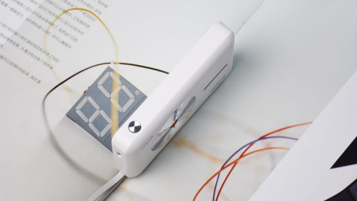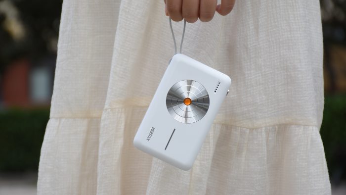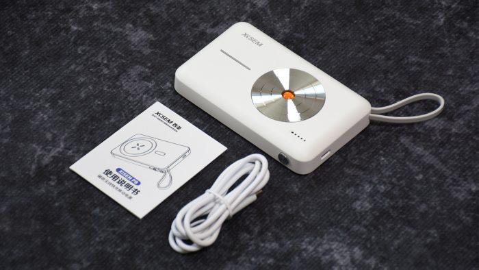 西圣PB无线充电宝的颜值非常高,白色的外壳显得简约干练,背部专门做了类似卡片相机的装饰,同心圆纹路金属片搭配中间的橙黄色指示灯,将时尚和复古两种风格巧妙地融合在一起,和上万块的iPhone搭配起来丝毫不显廉价感。