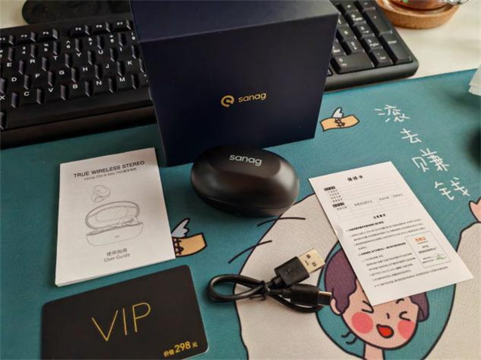 打开包装盒,可以看到塞那z50s AI MAX的包装盒里,配置有耳机充电舱、说明书、保修卡、充电线以及一张塞那APP的VIP卡一张。作为塞那老用户,看到这张卡我的眼睛都亮了,这意味着我的塞那AI会员又有用武之地了!