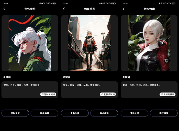 到了晚上九点多,我再次体验了一把AI绘画功能,先把三次免费次数用完,我获得了三张图,符合了我要求的白发。