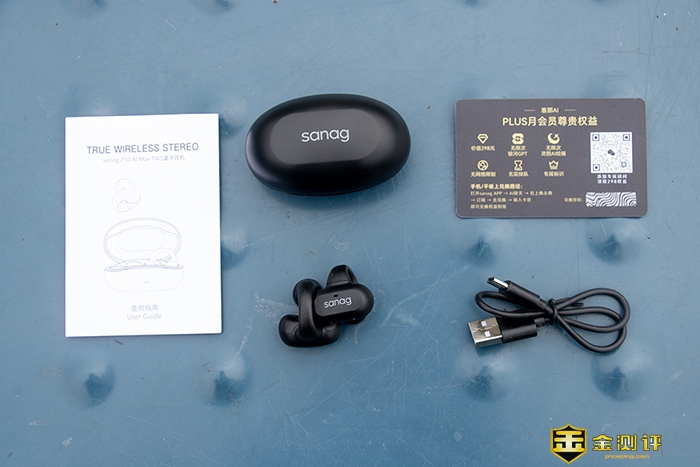 接下来,让我们打开包装盒一探究竟。里面装着Sanag塞那Z50 AI Max耳机,还附有详细的使用说明书,一张塞那AI体验卡,以及一根Type-C充电线。