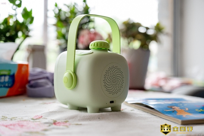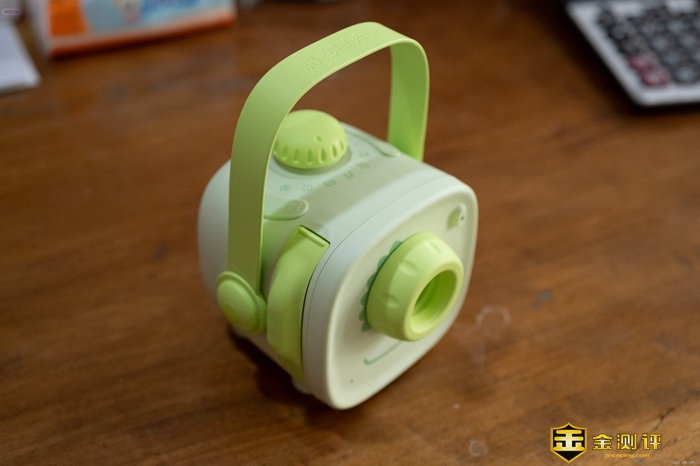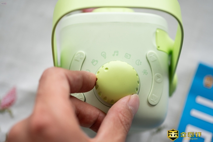 使用这款故事机只需要通过上面的物理按键就可以了,非常方便,操作方面,按键设计直观易懂。在机器的顶部就可用找到音量调节、播放暂停以及功能旋钮,孩子们可以轻松上手。在旋钮上面可以看到,这款故事机除了可以放映投影故事之外,还具有听书、音乐、配音等功能。