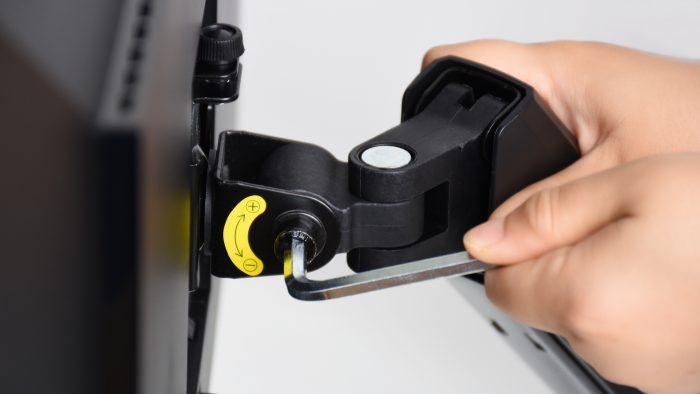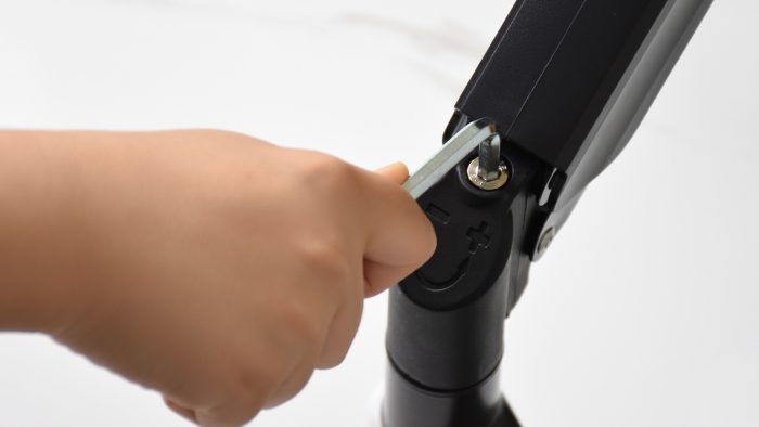 安装好以后,显示器的俯仰角度可能不太对,需要先调节支架臂头部俯仰关节侧边的螺丝,让显示器保持垂直状态。同时这颗螺丝也不要拧的太紧,要让后续还可以灵活调节俯仰角度。然后再调节支架臂承重量,螺丝位于支架臂两段关节连接处,出厂默认承重量是4-5公斤,最大承重量是9公斤,但一般不推荐达到最大负载。