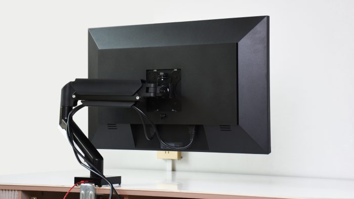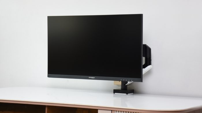 搭配支架臂以后,通过五个可活动关节的联动就可以更灵活的调节显示器,可以满足360度水平旋转、180度左右平移、70度俯仰调节和上下升降调节,甚至还可以向前或者向后移动显示器。
