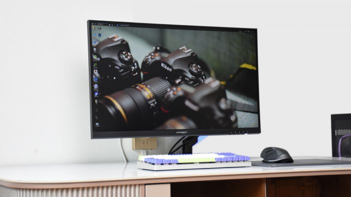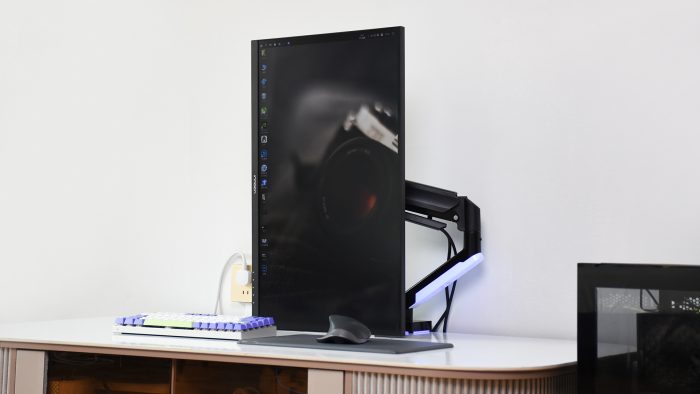 最后把显示器的电源线和信号线插好,通过支架臂的束线夹固定起来,显得更整洁一些。支架臂的RGB灯光需要用附送的USB-Type C线材供电,搭配一个5V-2A的充电器就可以。