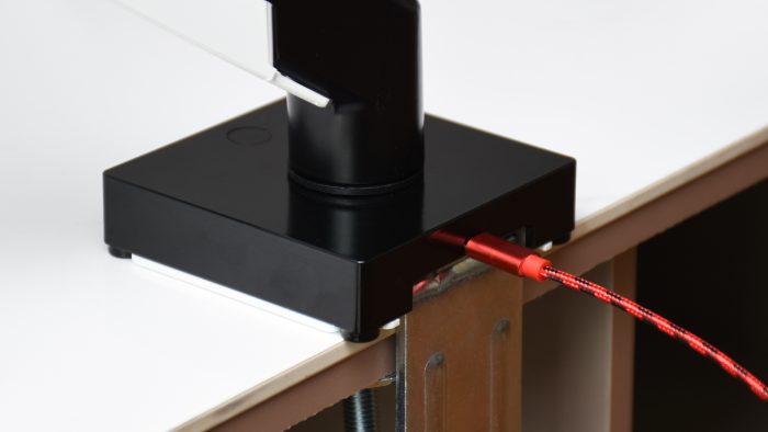接着就开始组装,顺便看看它的用料和做工如何。整个底座组件全部采用金属材质,底座外壳做了全黑色喷涂,上方和支架臂连接的部分以及连接件、螺丝都非常厚实,单看外观就给人一种可靠的品质感。另外,在底座背部预留有Type C接口,用于给RGB灯带供电,另一端的供电线材从连接支架臂的圆柱形中间延伸出来。
