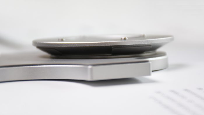 转换器分为两部分,安装的时候将小圆形部分放在iMac支架缘空内侧,不规则造型的部分在外侧,通过螺丝固定好。中间的圆孔还可以用来穿线材,不影响本身的功能。