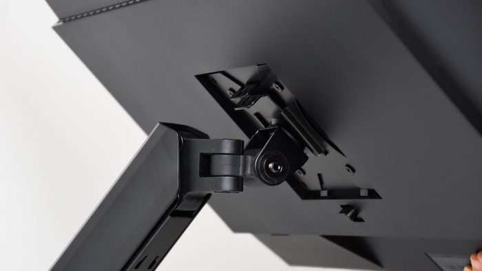 然后把附送的VESA适配器装到显示器背部,大多数显示器都预留有标准的VESA挂孔,四颗螺丝拧紧固定好就可以。将显示器整体搬起来,将VESA适配器对准支架臂头部的连接处插进去,再把螺丝固定好就可以了。