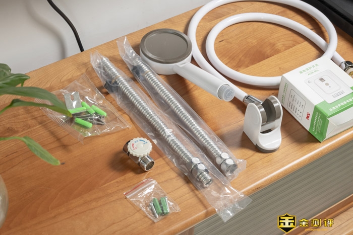 热水器附赠的配件很齐全,包括膨胀螺丝、挂件、不锈钢波纹管、调温阀等,另外还送了一套花洒和一个漏电保护器开关。