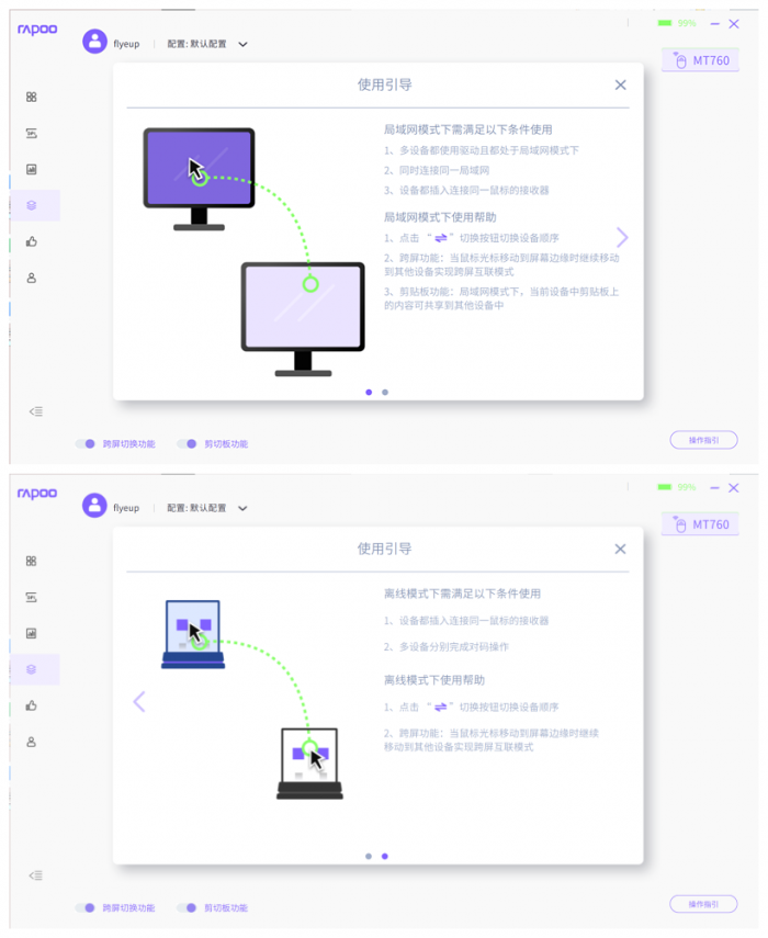 简单说,在在2.4G模式下通过驱动即可实现多台主机设备跨屏功能,至高可同时支持6台设备跨屏操作切换。