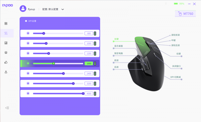 这里我在给大家详细说一下这款雷柏MT760系列亮点:MT760的侧滚轮采用了铝合金材质与霍尔磁感应轻声设计,不仅提升了滚动控制的精度和稳定性,还延长了使用寿命。对于经常需要处理大量文档和图片的用户来说,这一设计无疑是一个巨大的福音。此外,鼠标还配备了DPI按键,支持7档DPI调节(800/1000/1200/1600/2400/3200/4000),用户可以根据个人使用习惯随时调整精度需求。