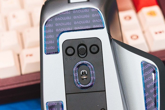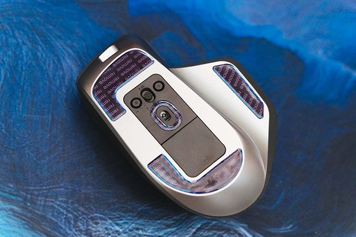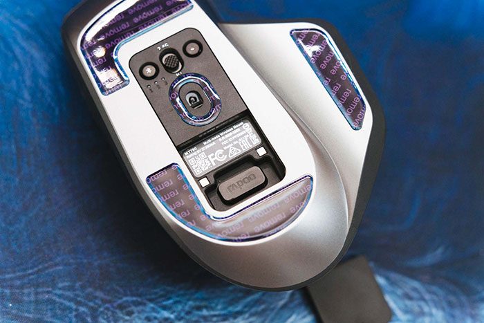 MT760&MT760 Mini的底部带有大面积的脚垫,移动时摩擦力刚刚好,在传感器上方有模式切换和配对切换按钮,MT760&MT760 Mini可以通过蓝牙、2.4G和有线连接最多5个设备,完全可以应对多设备的操作使用。传感器下方的盖板可以取下,内部带有一个2.4G接收器,同时该盖板也可以替换成无线充电模块,让MT760&MT760 Mini拥有无线充电性能。
