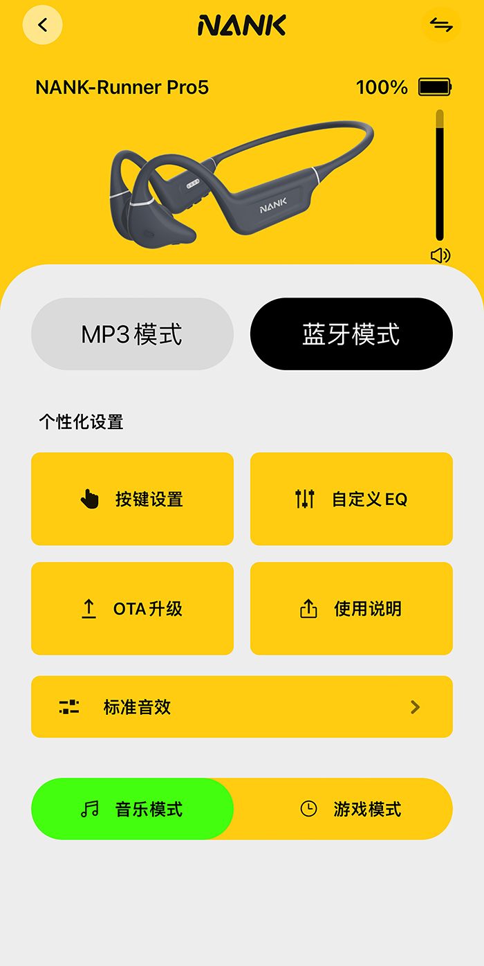 这次南卡还专门为NANK Runner Pro5设计了专属APP,有了APP后,可以直观地看到如电量等基本信息,还可以有更加细节化的定制,以往需要多次按键才能实现的功能现在只需要在APP里一键实现,更重要的是可以一键切换到游戏模式,这对于游戏玩家基本上属于福音。要说APP提供的功能除了上述快捷实现外,还可以调整按键功能、调整耳机的音效,这在骨传导耳机界还是比较少的进步。