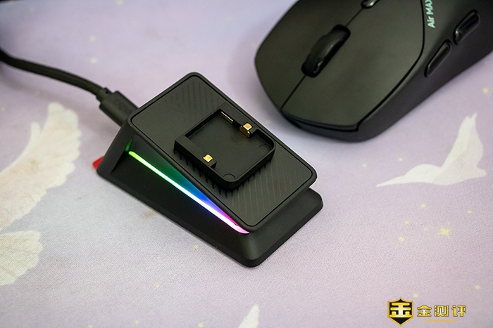 鼠标还能拓展触点充电功能,在传统线充的基础上,增加电极点充电,充电底座还有炫彩的灯带设计,夜晚的小互动,感觉科技感更加强烈。