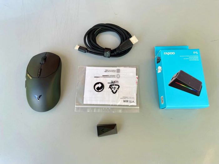 ▲ 雷柏VT1PRO MAX鼠标的配件包括:鼠标、连接线、连接头、脚贴、说明书,算是现在鼠标的标准配置了。这款鼠标还支持无线/触点充电,不过P触点充底座需要单独购买。