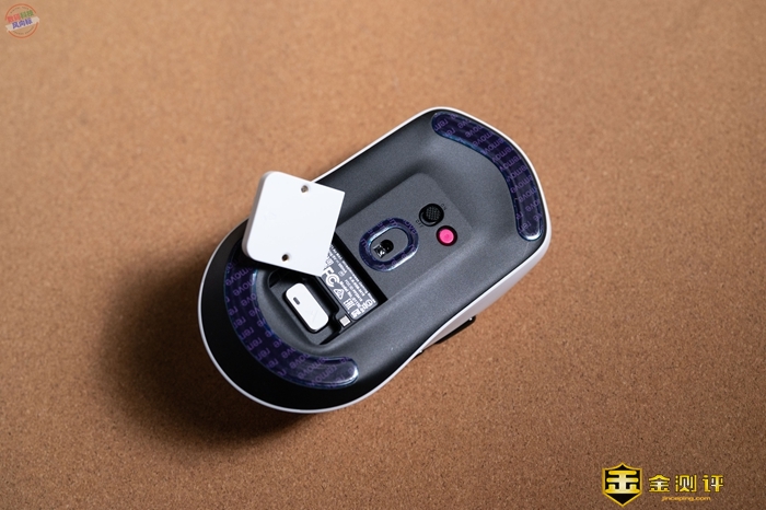 翻到鼠标底部,可以看到这里采用了雷柏之前的设计格局,脚贴采用特氟龙材质,让鼠标的移动操控更加灵活。另外鼠标底部还可以找到一枚可以自定义的按键,另外还有带有盖子的无线接收器收纳仓设计简约,通过磁吸固定,可以切换为P5的触电充电盖,或者是P3无线充电模块。