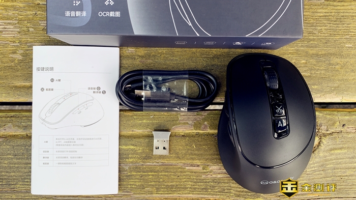 包装方面设计得很简洁,正面印有鼠标的型号、主打功能点和产品轮廓图。配件方面除了鼠标本体、说明书另外还很贴心地提供了:USB2.4G无线接收器、数据线。格之格GS80 AI Pro智能鼠标支持2.4G模式、蓝牙1模式、蓝牙2模式无线三模连接,可以很自由的切换三台设备。